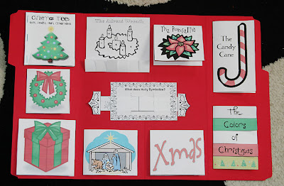 I made up a sample since I had to choose from MANY options of symbols to include, and make sure what I chose, fit! Here is a photo, so you can see what it looks like. Most are just little fold in half “minibooks” where you write the symbolism on the inside. The colors one is a flap book, with each color flipping open. The Tree is actually a stapled minibook with several pages to write the symbolism of all the things found on a tree (and also of the tree). On the back I am putting the Jesus is better than Santa poem.
