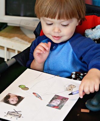 And here you can see K pointing to his friend Kingsley, who is pictured on his K sheet! We have tons of fun putting people’s photos (and pets) on the sheets and naming them as well as the items.