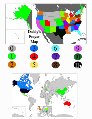 Daddy’s prayer map is complete! We heard from over 175 people between both blogs and hit almost every state and many countries! it was really exciting to watch the comments come in and to know that prayers have been lifted up for our Daddy and family!!!! Here Pac-Man is showing the printed copy to his Daddy for the first time, Daddy was amazed!!!