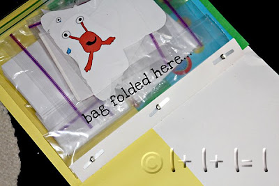 I added the file folder game I made to the front pocket, as well as the mini book, “Monster Eyes.” The mini book could easily go into a baggie too, I just kept it out for now. The pockets are also great for storing projects that we are partially done with, so I don’t forget about them (if there’s coloring involved or something like that).