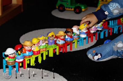 We put the colors in a row like a train, he had to find the right “seat” for each character. Then he got his own seat (Ladybug’s Bumbo), and hopped on the train!